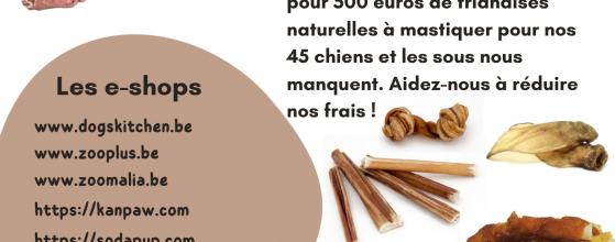 Nous offrons quotidiennement à nos 45 chiens des objets adaptés à mastiquer et à lécher mais ces friandises pèsent lourd dans notre budget : plus de 500 euros par mois !Mais ces achats sont indispensables : la mastication est l’un des besoins les plus importants du chien. Cette activité libère chez le chien de l’endorphine, une hormone que sécrète son cerveau et qui se répand dans l’organisme en do