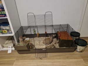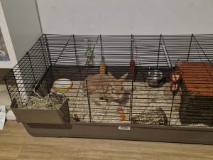 Une fois rentrés à la maison, on l’a mis dans sa nouvelle grande cage et il s’est amusé à tout explorer : la roue, le tunnel, la petite maison, les étages et la litière. Il a joué dans son nouveau chez lui puis il a creusé pour faire son nid. Dans un premier temps, on lui a laissé sa boule de coton qu’il avait au refuge pour le rassurer.
