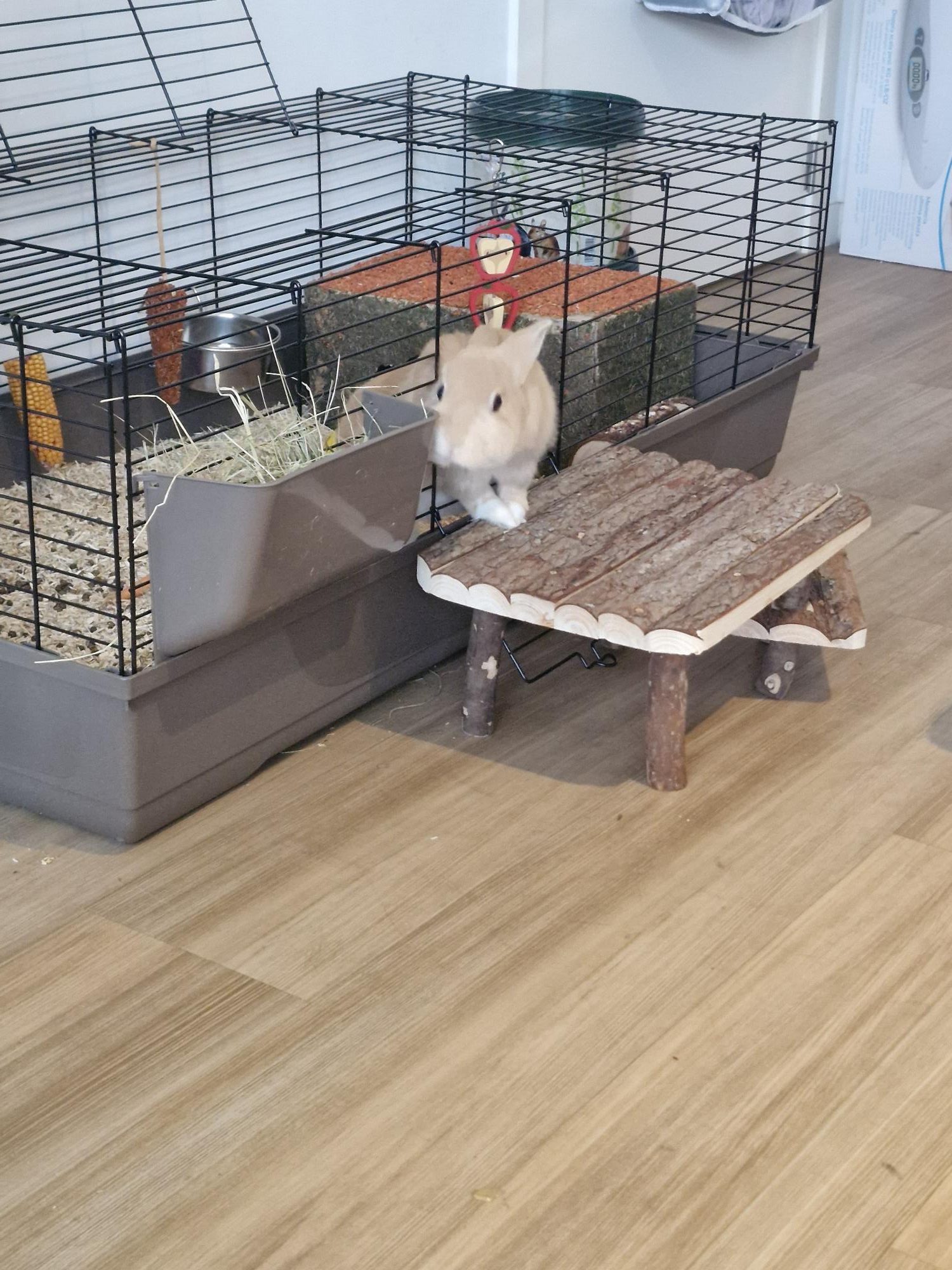 Les lapins sont des animaux qui ont besoin de compagnie. Alors ce n’est jamais gagné, mais Patate la lapine a trouvé son âme soeur en Yuko – notre lapin bélier blanc/noir. Avoir deux lapins en même temps leur semble bénéfique, et nous aussi, on rit beaucoup quand on les voit courir les uns derrière les autres ou se laver mutuellement ou encore poursuivre les chats. Par contre aie aie ça grignotte un lapin… jamais à l’abri d’une bêtise!