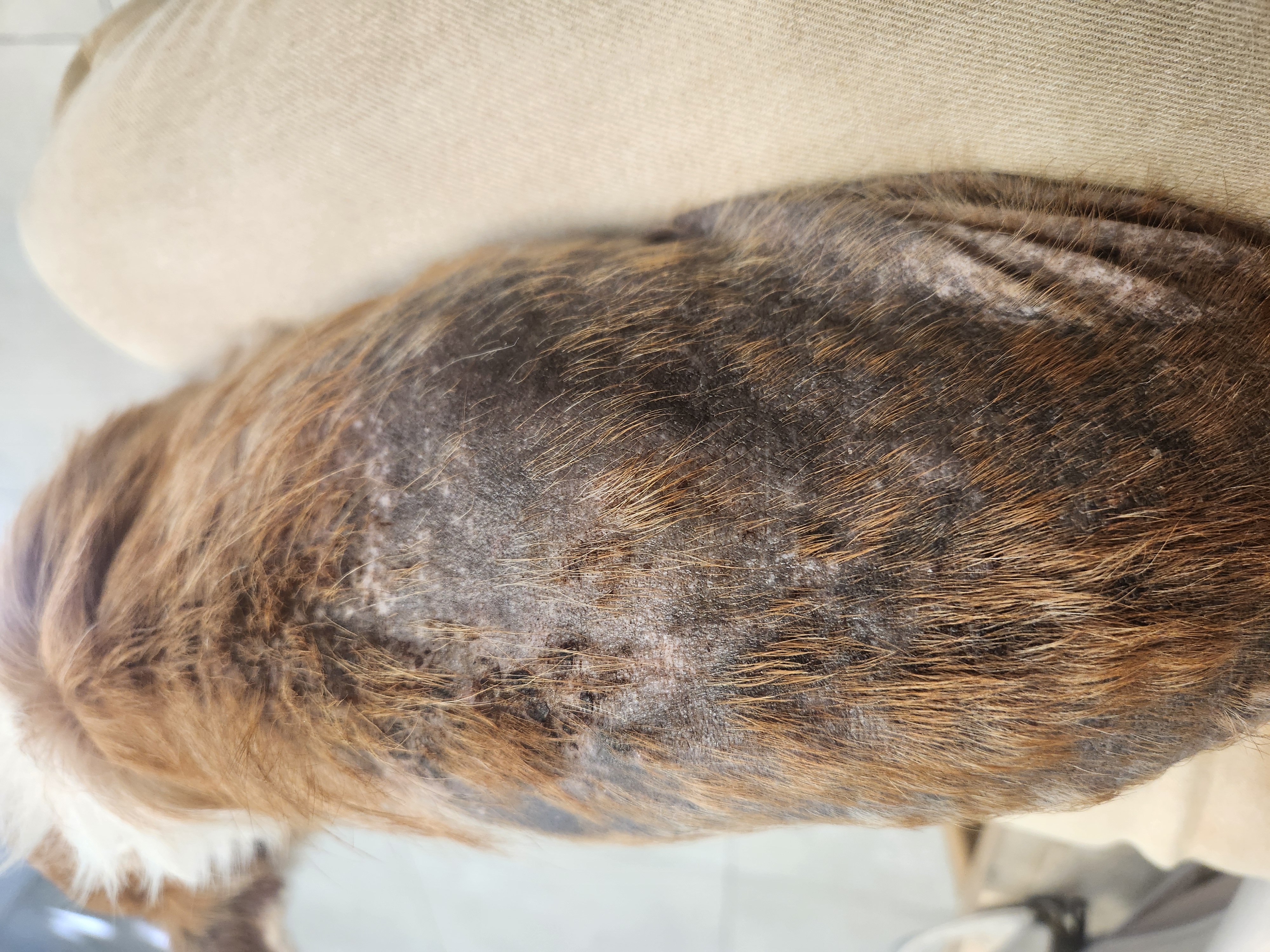 Kali doit prendre des médicaments tous les jours car il fait de l’eczéma et perd ses poils sans eux.