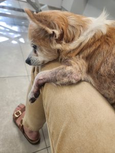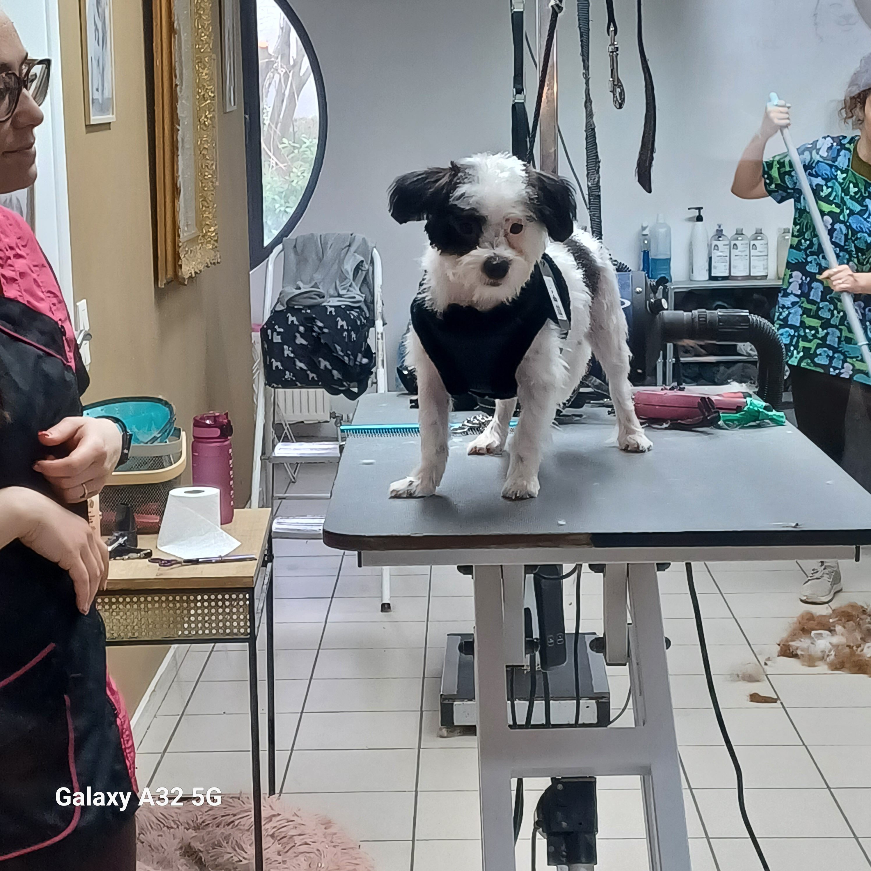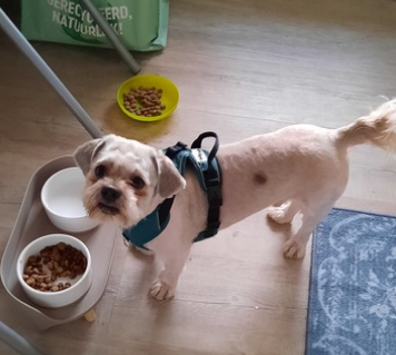 Je vais prendre contact avec un comportementaliste afin qu’il puisse profiter plus de nos sorties. Ma vétérinaire est déjà venue à la maison pour un check-up, on va régler un rendez-vous afin de le peser pour savoir quelle quantité de croquettes à donner.
