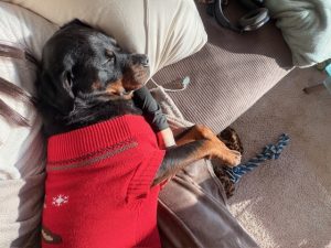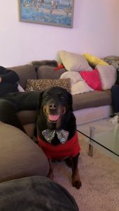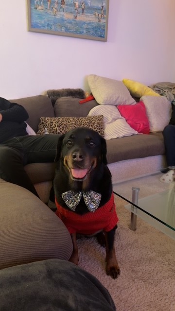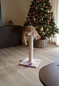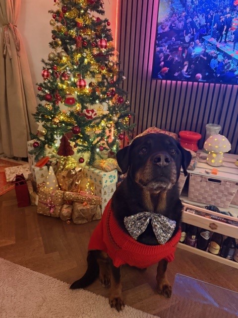 Bonjour, quand vous êtes venus à la maison on vous avait promis une photo de Winky ! Donc en voici une dans le thème de Noël ! N’est-il pas trop chou ?