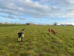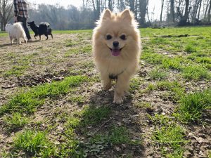 On a déjà croisé plusieurs chiens, je lui montre son jouet et il se calme.