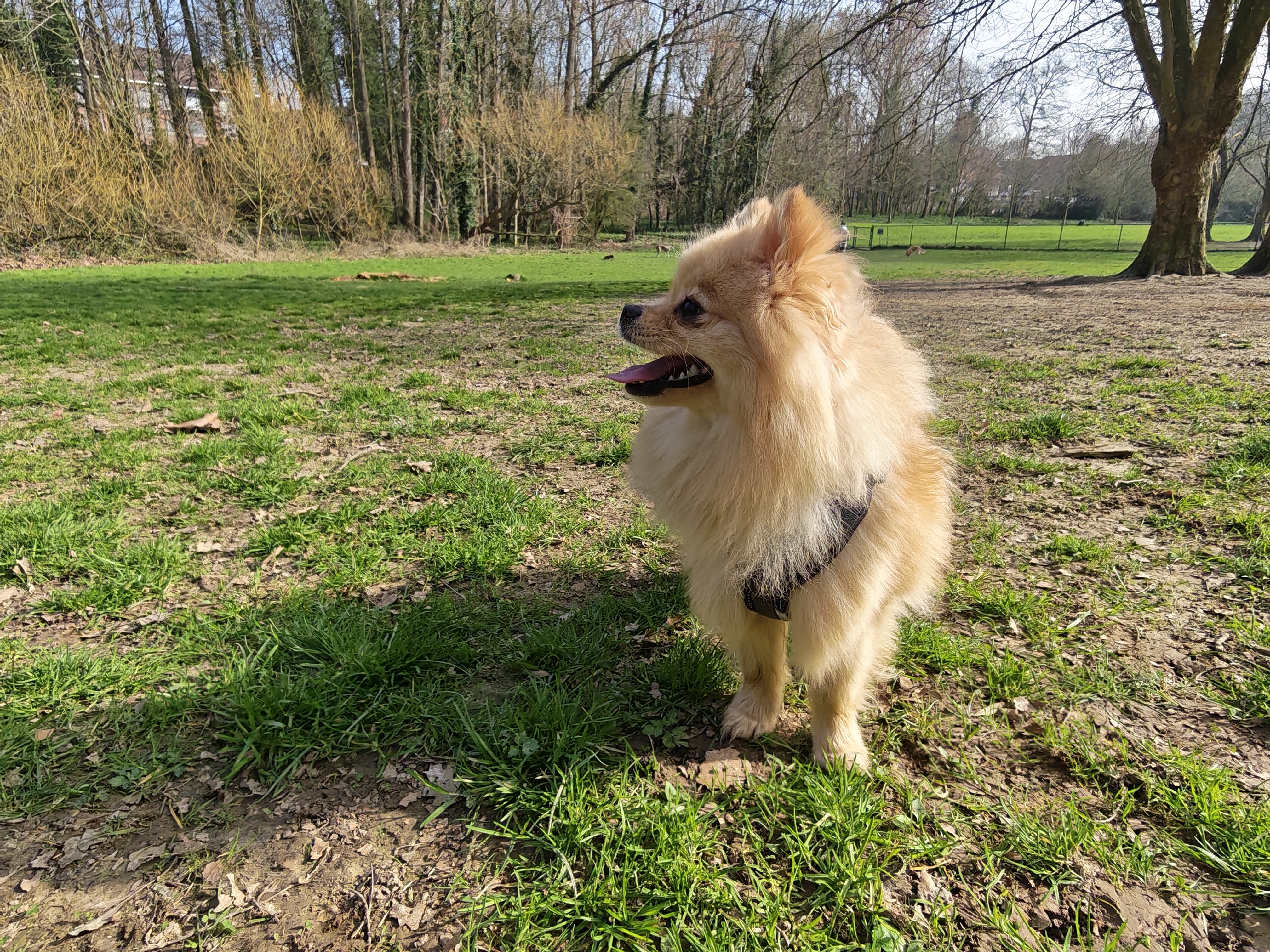 Je fais aussi des promenades en rue avec un harnais, il marche à côté de moi sans tirer.